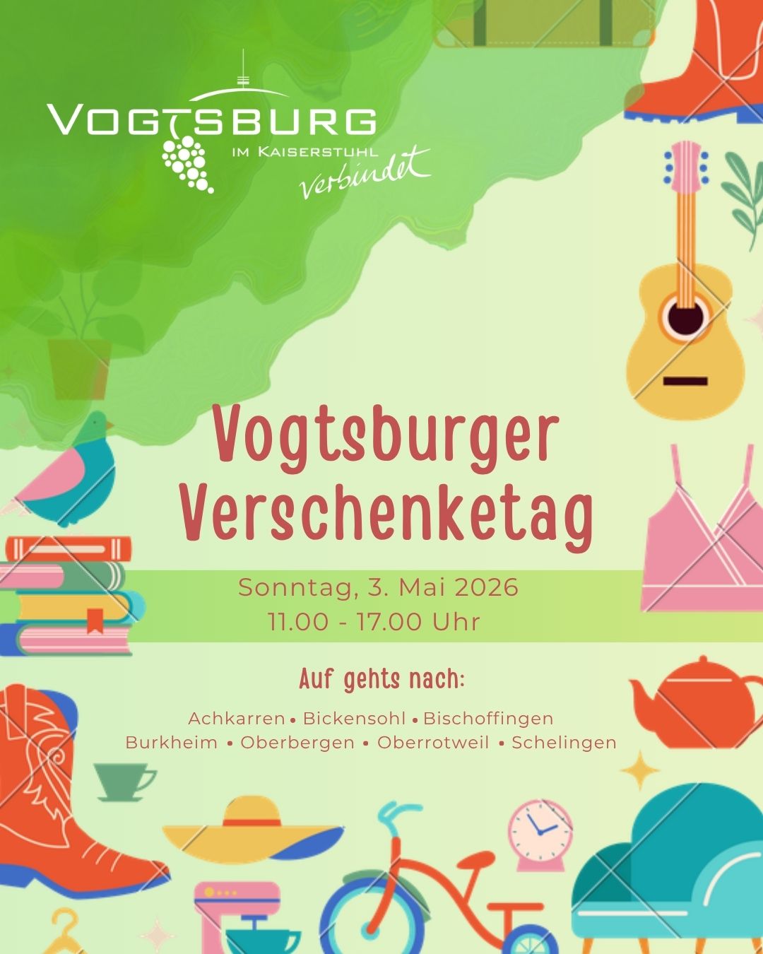 Am Sonntag, 03. Mai 2026, findet der Vogtsburger Verschenketag erneut statt. Hier haben Sie die Möglichkeit gut erhaltene Sachen des täglichen Gebrauchs (z.B. Bücher, Spielzeug, Kleidung, Küchenutensilien, Dekoration u.v.m.) auf ihrem eigenen Grundstück an die Straße zu stellen.