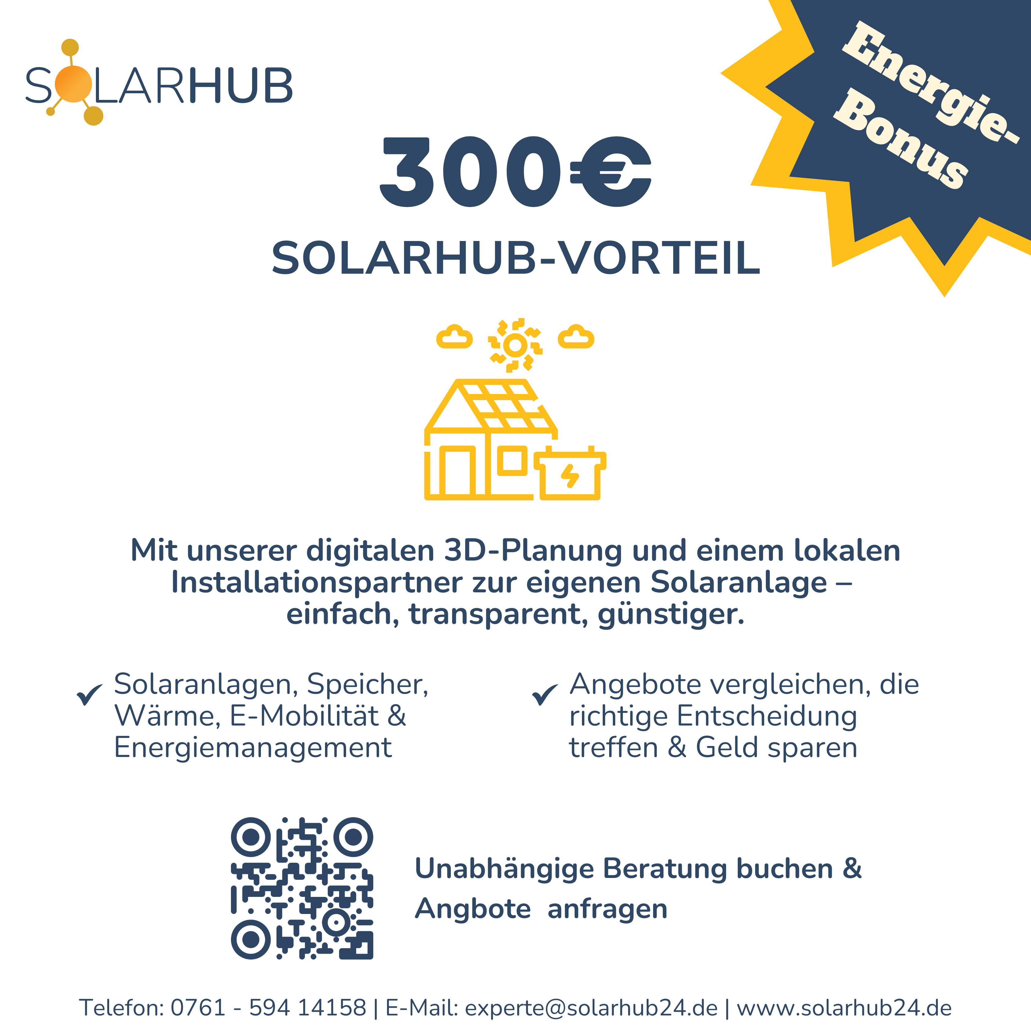 Wenn Sie im Zeitraum vom 01. bis 31. Oktober 2025 an einem persönlichen Beratungstermin teilnehmen, erhalten Sie 300 € Rabatt von SolarHub auf die Errichtung Ihrer PV-Anlage durch einen SolarHub-Partnerbetrieb.