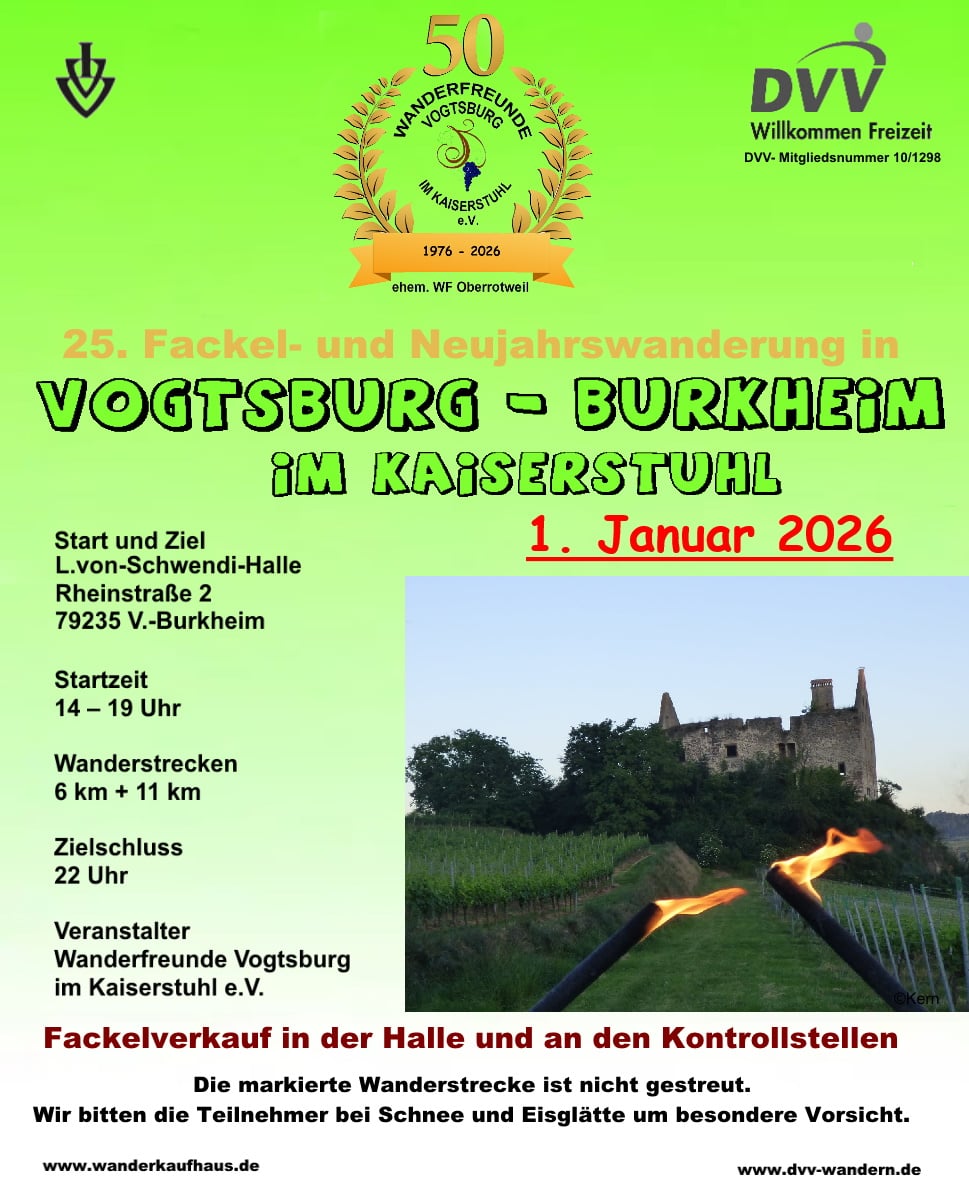Die Wanderfreunde Oberrotweil e.V. laden herzlich ein zur traditionellen 25. Neujahrs- und Fackelwanderung am 1. Januar 2026 in Burkheim.