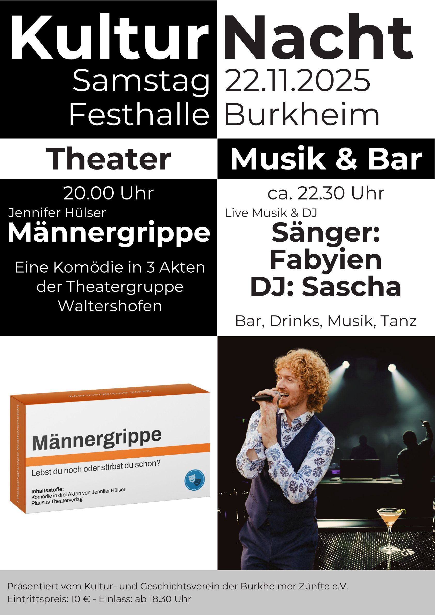 Der Geschichtsverein Burkheim lädt herzlich zur diesjährigen Kulturnacht am Samstag, den 22. November 2025, in die Festhalle Burkheim ein. Das kulturelle Highlight beginnt um 20.00 Uhr und verspricht einen abwechslungsreichen Abend voller Unterhaltung und Geselligkeit.