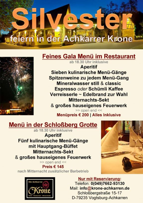 | Hinweise: | Nur mit Reservierung: 0(049)7662-93130 / info@krone-achkarren.de |